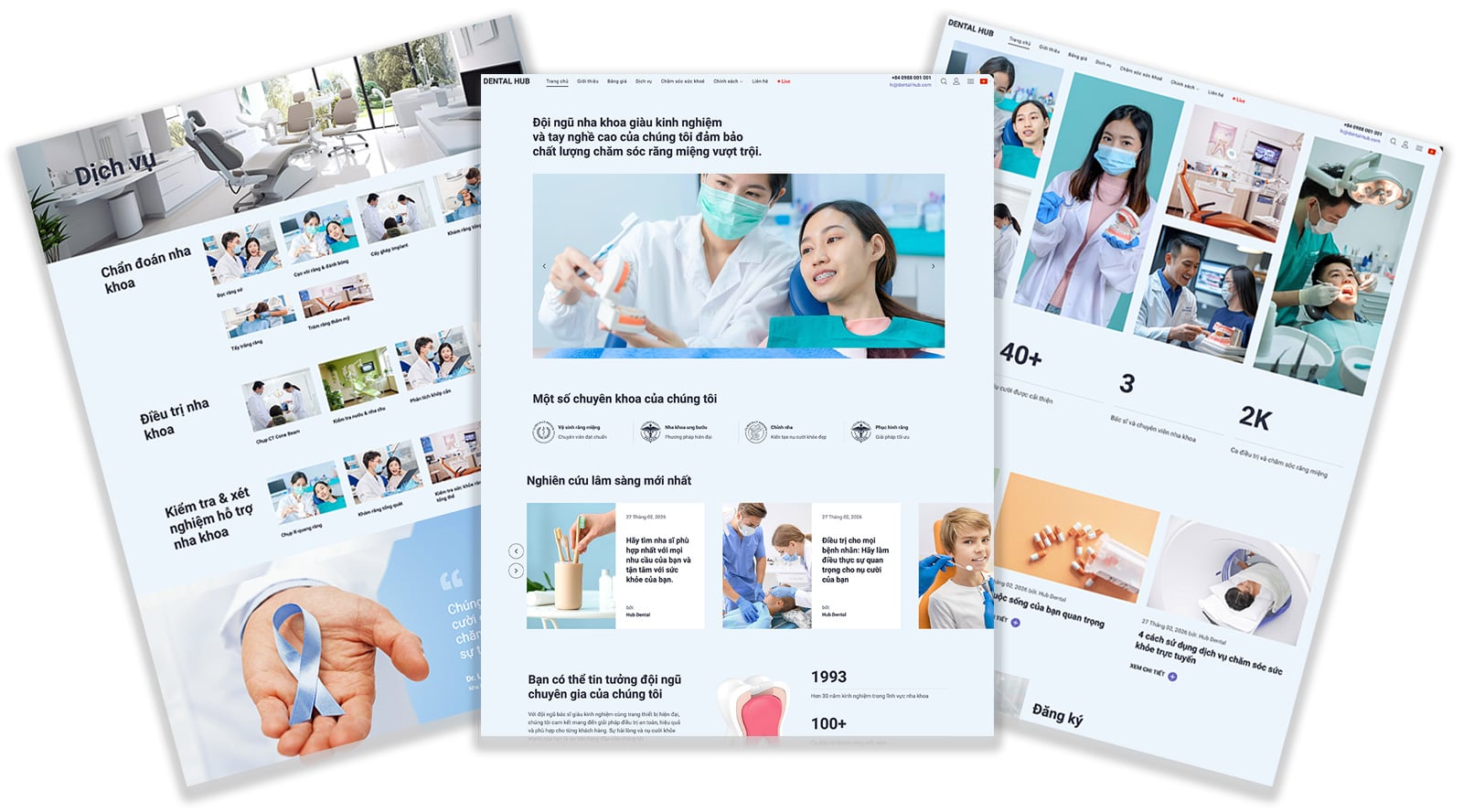 Dental Hub sở hữu phong cách thiết kế hiện đại với tông màu trắng - xanh y tế chủ đạo, tạo cảm giác sạch sẽ, an toàn và chuyên nghiệp. Bố cục được tối ưu theo trải nghiệm người dùng (UX) ngành dịch vụ cao cấp, giúp khách hàng dễ dàng tiếp cận thông tin quan trọng như: Bảng giá, Đội ngũ bác sĩ và Quy trình điều trị.