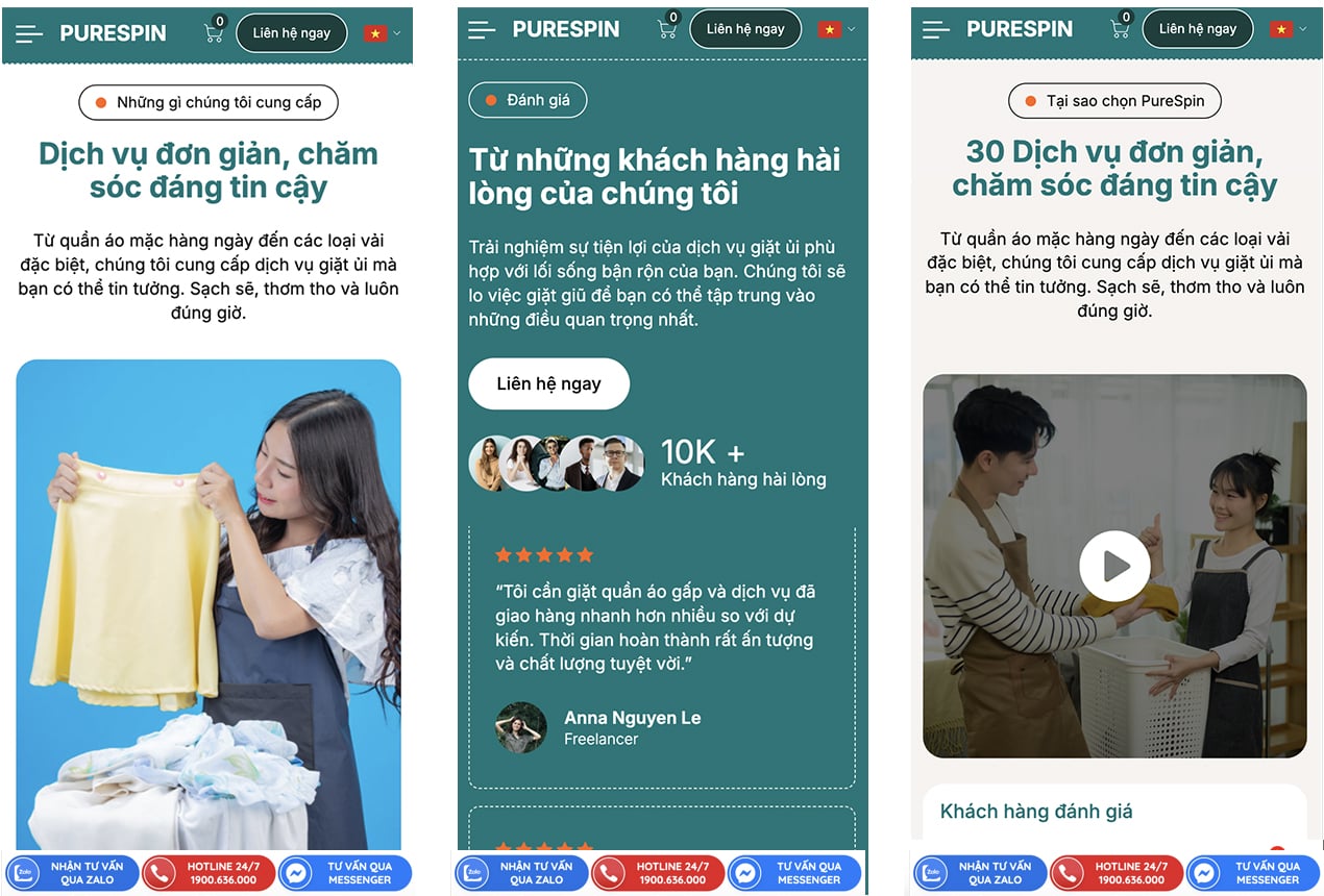 Không chỉ dừng lại ở yếu tố trình bày, Purespin còn chú trọng mạnh vào trải nghiệm người dùng (UX). Các nút kêu gọi hành động (CTA) như “Đặt lịch ngay”, “Liên hệ tư vấn” được đặt đúng vị trí chiến lược, giúp rút ngắn hành trình chuyển đổi. Phần form đăng ký/đặt dịch vụ được thiết kế đơn giản, dễ thao tác, giảm thiểu tối đa rào cản khi khách hàng muốn sử dụng dịch vụ. Ngoài ra, mục Đánh giá của khách hàng đóng vai trò củng cố niềm tin, giúp khách hàng an tâm hơn trước khi đưa ra quyết định.