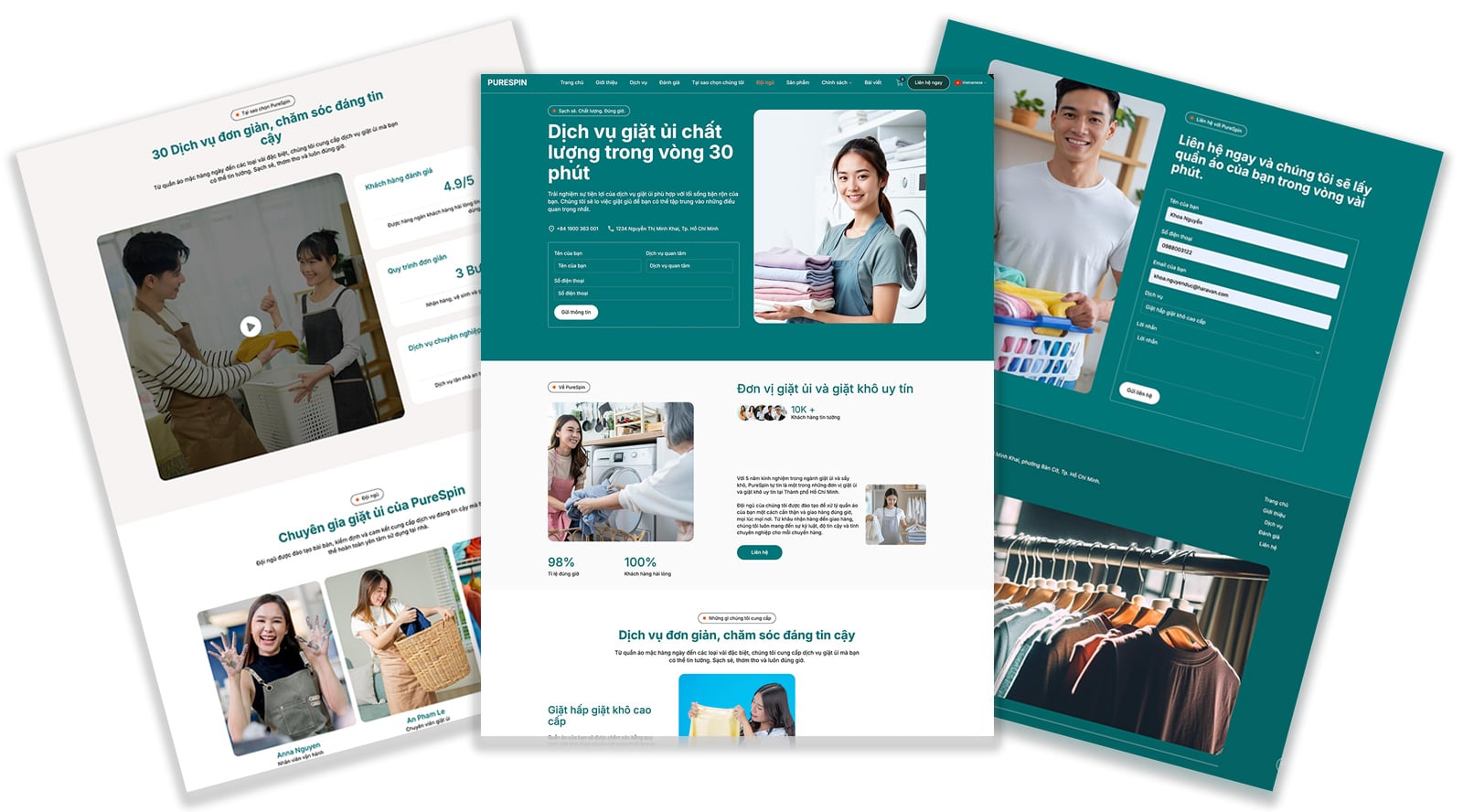 Điểm mạnh nổi bật của Purespin nằm ở cấu trúc landing page tối ưu chuyển đổi, giúp toàn bộ nội dung được trình bày liền mạch trong một trang duy nhất. Người dùng có thể dễ dàng tiếp cận mọi thông tin quan trọng chỉ bằng thao tác cuộn: từ phần hero banner thu hút với thông điệp rõ ràng, đến các khối dịch vụ được minh họa trực quan, quy trình làm việc từng bước (“How it works”), và các đánh giá thực tế từ khách hàng. Tất cả được sắp xếp logic nhằm dẫn dắt hành vi người dùng đi từ nhận biết → tin tưởng → hành động.
