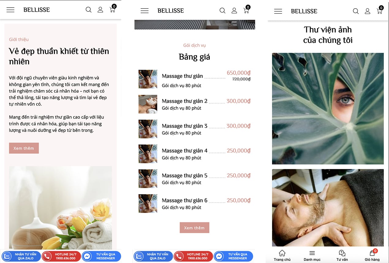 Tích hợp đa kênh Chăm sóc khách hàng: Bellisse hiểu rằng sự hỗ trợ kịp thời là chìa khóa của dịch vụ hoàn hảo. Các nút liên kết nhanh (Zalo, Hotline, Messenger) được bố trí tinh tế ở góc màn hình, luôn sẵn sàng kết nối khách hàng với tư vấn viên. Kết hợp cùng các pop-up ưu đãi (giảm 50% cho lần ghé thăm đầu tiên), giao diện giúp chuyển đổi sự quan tâm thành hành động thực tế một cách tự nhiên nhất.