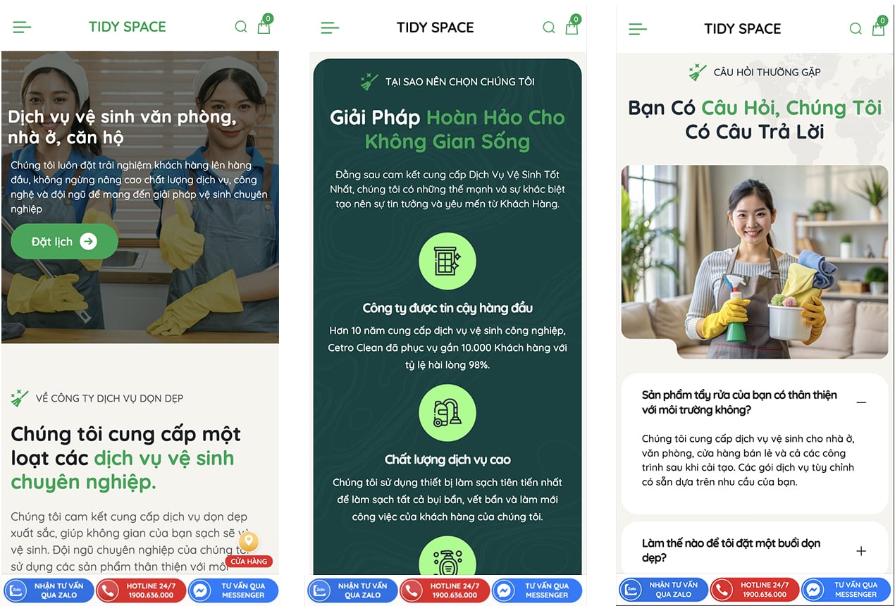 Đúng như tên gọi, Tidy Space sở hữu một giao diện cực kỳ thoáng đãng với tư duy thiết kế tối giản, dịch vụ trực quan, website tạo cảm giác tin cậy, an tâm ngay từ giây đầu tiên khách hàng truy cập. Đây là yếu tố tâm lý then chốt: Một website sạch sẽ chính là lời khẳng định ngầm về chất lượng dịch vụ dọn dẹp mà bạn cung cấp.