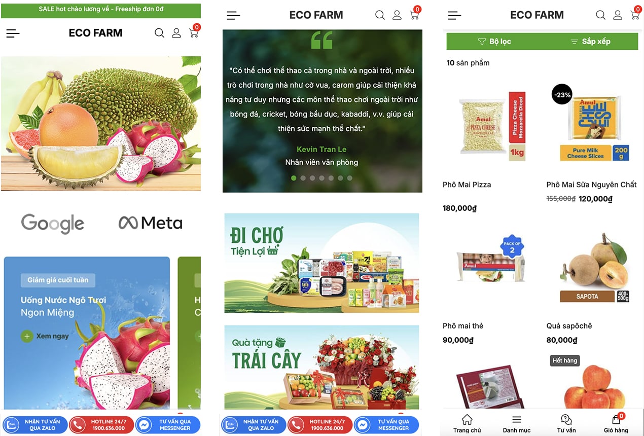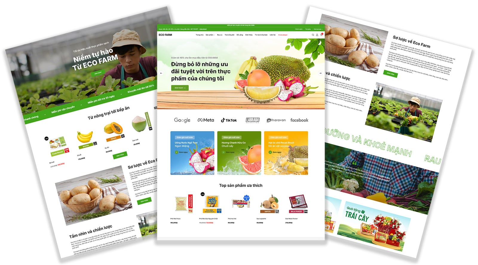 Eco Farm là giao diện website bán hàng được thiết kế chuyên biệt cho các doanh nghiệp và cửa hàng kinh doanh nông sản sạch, thực phẩm hữu cơ, đặc sản địa phương và sản phẩm từ trang trại. Sở hữu phong cách thiết kế xanh – sạch – gần gũi thiên nhiên, Eco Farm giúp thương hiệu tạo ấn tượng tin cậy ngay từ lần truy cập đầu tiên.