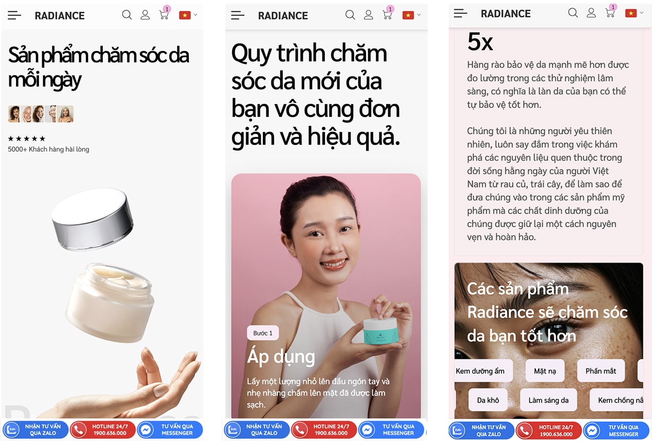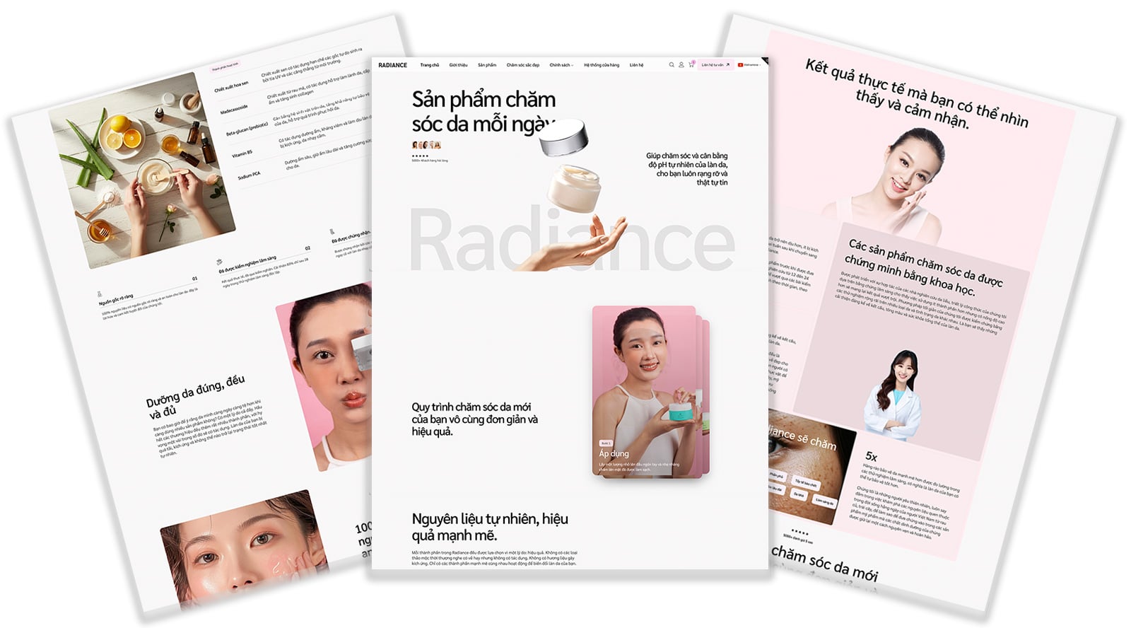 Điểm mạnh nổi bật của Radiance nằm ở khả năng kể chuyện thương hiệu (brand storytelling). Các section được bố trí theo flow tự nhiên: từ banner truyền cảm hứng → giới thiệu sản phẩm → giá trị thương hiệu → feedback khách hàng → CTA rõ ràng. Điều này giúp dẫn dắt cảm xúc người dùng và tăng tỷ lệ chuyển đổi một cách hiệu quả – đúng với định hướng tối ưu conversion của hệ sinh thái Haravan .