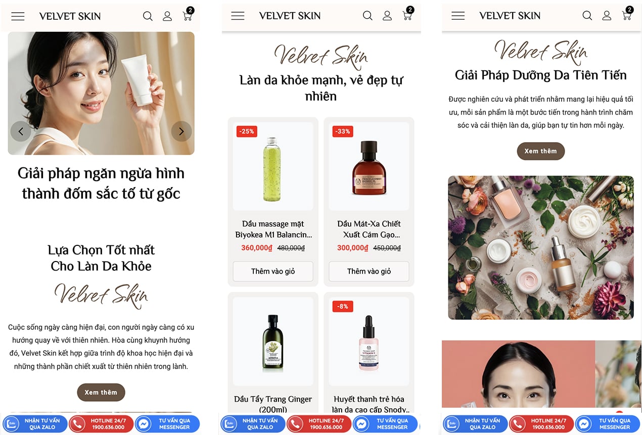 Tổng thể, Velvet Skin không chỉ là một giao diện bán hàng, mà còn là một công cụ marketing toàn diện, giúp thương hiệu mỹ phẩm xây dựng hình ảnh cao cấp, tạo niềm tin với khách hàng và tối ưu doanh thu một cách bền vững. Đây là lựa chọn lý tưởng cho những ai muốn biến website thành “cửa hàng flagship online” – nơi mỗi chi tiết đều góp phần nâng tầm trải nghiệm và giá trị thương hiệu.
