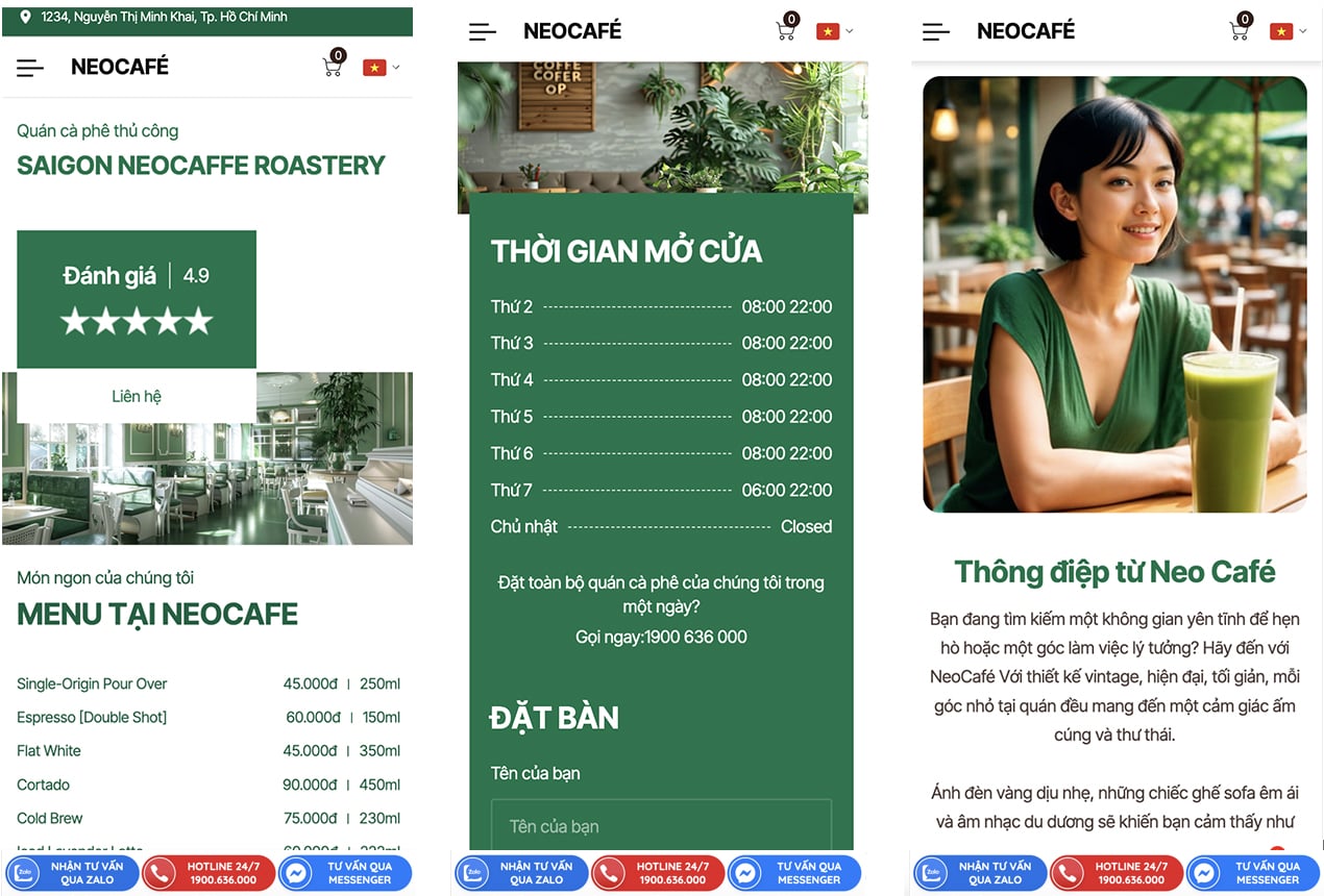 Một điểm cộng lớn của NeoCafe là khả năng kể câu chuyện thương hiệu (brand storytelling). Không chỉ dừng lại ở việc bán sản phẩm, giao diện này giúp bạn xây dựng một không gian số mang đậm “chất riêng” – từ nguồn gốc hạt cà phê, quy trình rang xay đến phong cách sống mà thương hiệu hướng đến. Điều này đặc biệt phù hợp với các quán cà phê specialty hoặc mô hình kinh doanh chú trọng trải nghiệm.