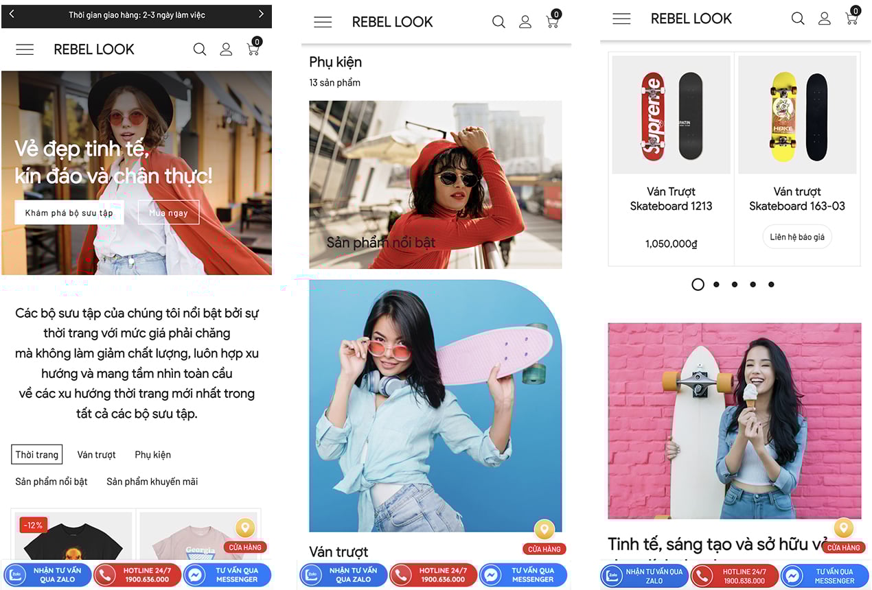 Tối ưu hóa Trải nghiệm Di động (Mobile First): Hiểu rõ xu hướng mua sắm online, Rebel Look được tối ưu hóa hoàn hảo trên mọi thiết bị di động. Các thao tác "vuốt và chạm", menu điều hướng mượt mà giúp khách hàng dễ dàng tìm kiếm và đặt mua sản phẩm chỉ trong vài giây.