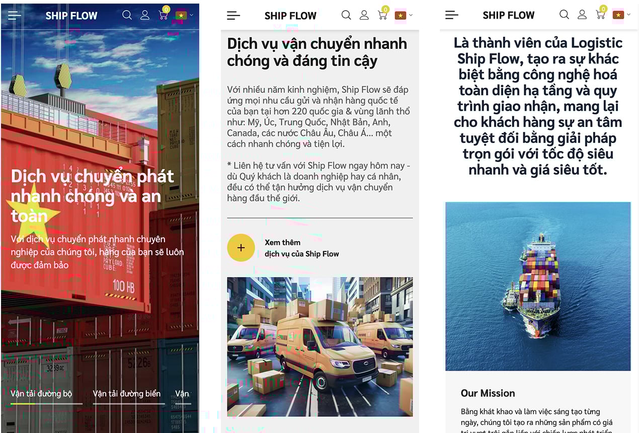 Với thiết kế tập trung vào sự tin cậy và trải nghiệm người dùng, “Ship Flow” giúp doanh nghiệp kết nối khách hàng ngay từ trang web đầu tiên, giới thiệu dịch vụ rõ ràng và tăng tỉ lệ chuyển đổi hiệu quả, đặc biệt phù hợp với các doanh nghiệp logistics,, kho bãi hay vận chuyển.